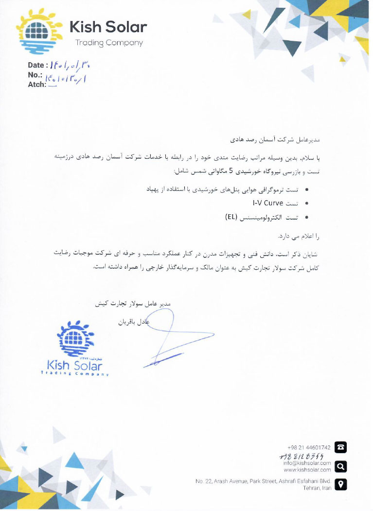 گزارش واحد مرکزی خبر از فعالیت های فناورانه شرکت آسمان رصد هادی در حوزه تست نیروگاه های خورشیدی