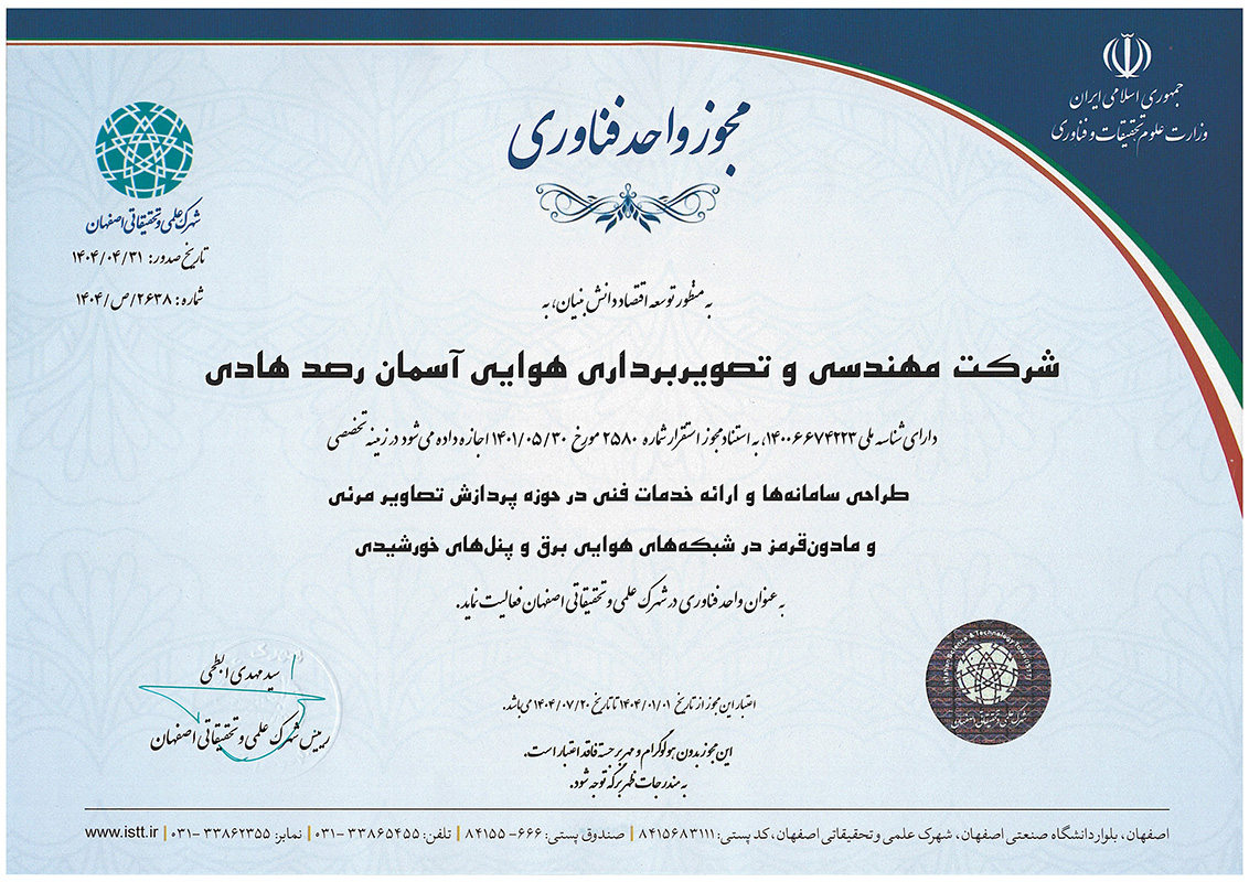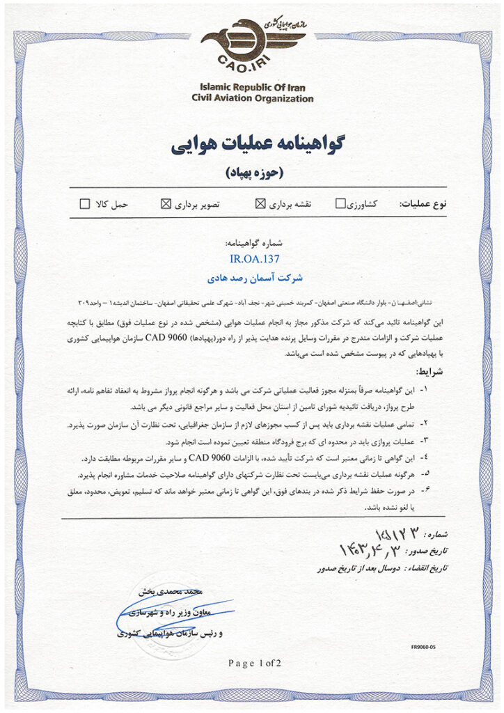 - دارا بودن مجوز رسمی عملیات پهپاد از سازمان هواپیمایی کشوری، جهت انجام پایشهای هوشمند و دقیق